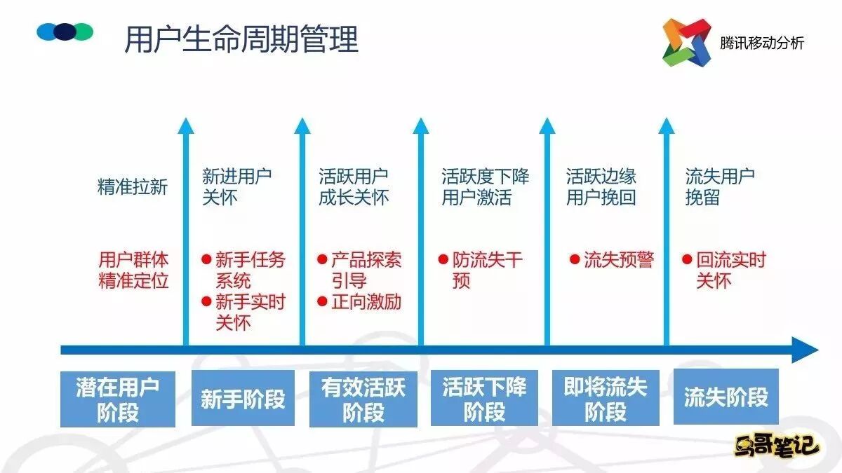 分为6个阶段:潜在用户阶段、新手阶段、有效活跃阶段、活跃下降阶段、即将流失阶段、流失阶段。每个阶段,都依赖于具体的数据的分析,然后再做针对性的运营活动。