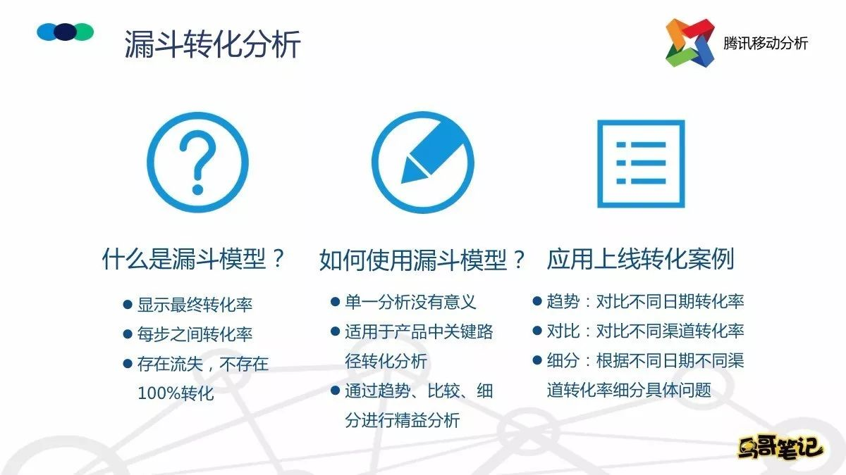 这也是一个经常用的分析方法,因为它不仅可以帮你分析从第一步到最终的转化率的情况,还可以分析每步的转化率。对于漏斗,单一的分析没有意义,如果不去对比,很难发现问题所在,所以要通过趋势、比较、细分,做一个更细致的分析。