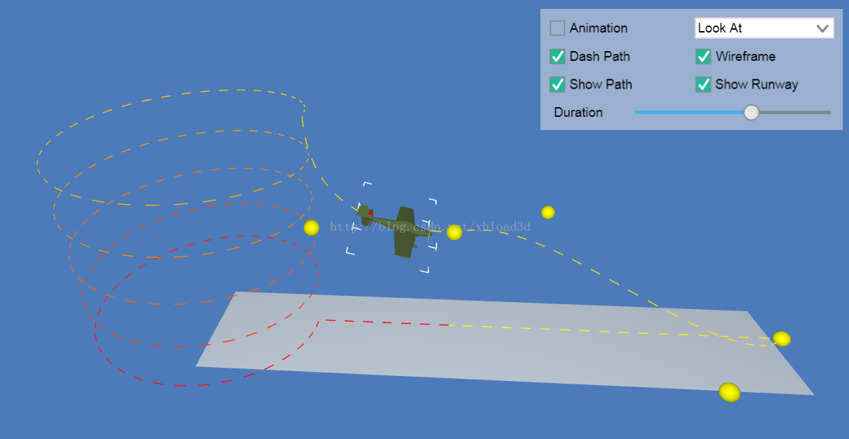 这个例子基本上完全模拟了飞机的飞行模式,包括起飞跑道,包括飞机的移动路径,螺旋桨的旋转,机尾的指示灯等部分。