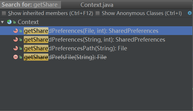 SharedPreferences对象是Context中getSharedPreferences()方法返回的,我们先找到这个方法,在IDE中经过搜索,发现Context中有两种getSharedPreferences()方法,如下: