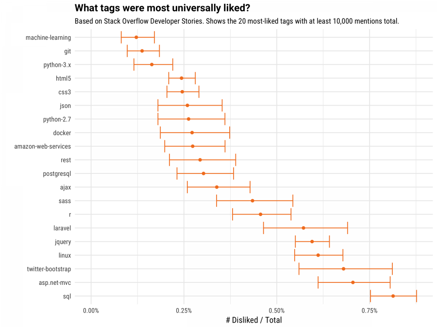 Git might be a source of frustration to many developers (it certainly is for me!), but it’s rare that people admit it on their resume, as it’s the most lopsidedly-liked tag in our Developer Stories. R makes this list, but it’s not the only data-science-related tag that’s uncontroversial; the machine learning tag was liked by 23 thousand people and was quite rarely disliked. Tags such as Python-3.X, CSS3 and HTML5 could indicate that developers rarely specify that they dislike a specific version of a technology (even if they specify). And of course, jQuery is as popular as ever on Stack Overflow.