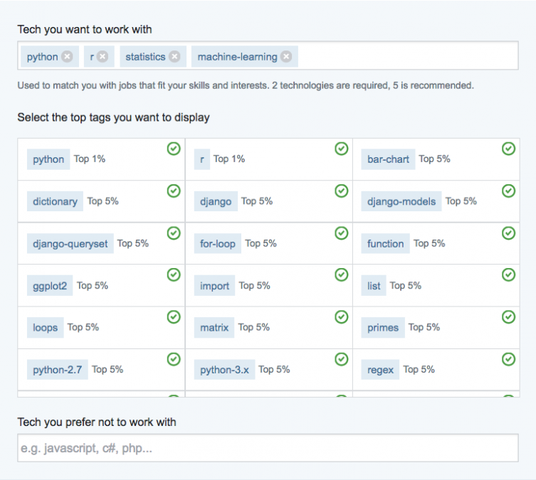 On Stack Overflow Jobs, you can create your own Developer Story to showcase your achievements and advance your career. One option you have when creating a Developer Story is to add tags you would like to work with or would not like to work with: