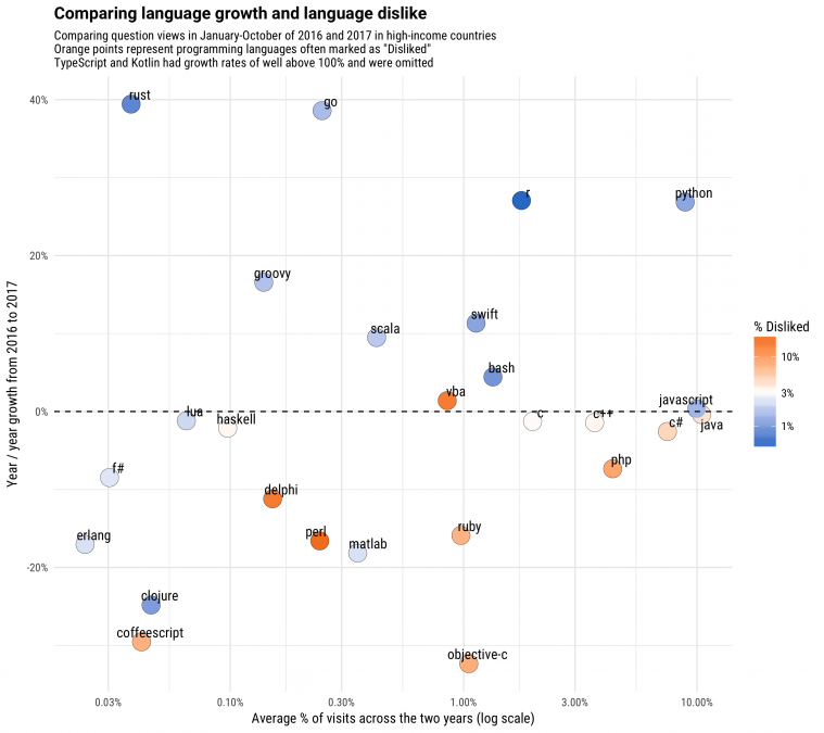 We can examine this by comparing the size and growth of each language to the % of people disliking it, with orange points representing the most disliked languages. To keep our analysis consistent with the last few posts, we’ll limit the statistics to high-income countries (such as the US, UK, Germany, and Canada).