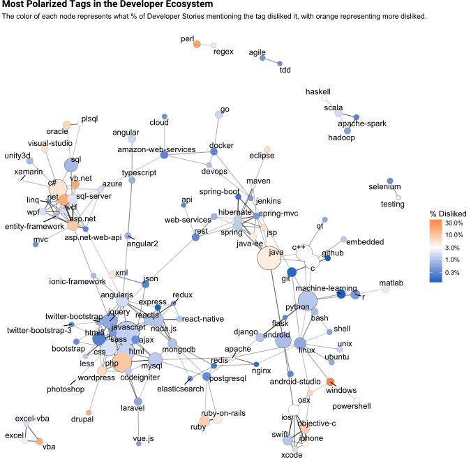 By laying out Developer Story tags into sub-ecosystems, this network tells a story about what types of tags tend to be polarizing. There are clusters of polarizing tags within the sub-ecosystems for Microsoft (centered around C# and .NET), PHP (along with WordPress and Drupal), and mobile development (particularly Objective-C). Within the cluster of operating systems (lower right), we can see that systems such as OSX and especially Windows have their detractors, but tags like Linux, Ubuntu and Unix don’t.