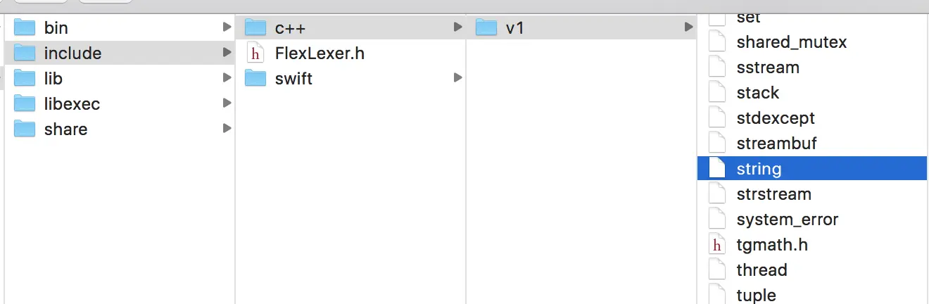 如果你的项目中有诸如 #include <string> 这样的引用,在使用本地 Clang 编译时,Xcode 会提示头文件找不到,这正是因为,Xcode 版本的 Clang 多出了一些文件: