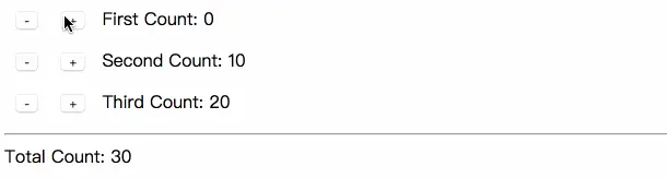 首先我们先用没有任何状态管理框架来做这个例子,由于总计数器组件的值需要结合三个计数器的值之和,形成联动的效果,根据下面的即可查看效果。