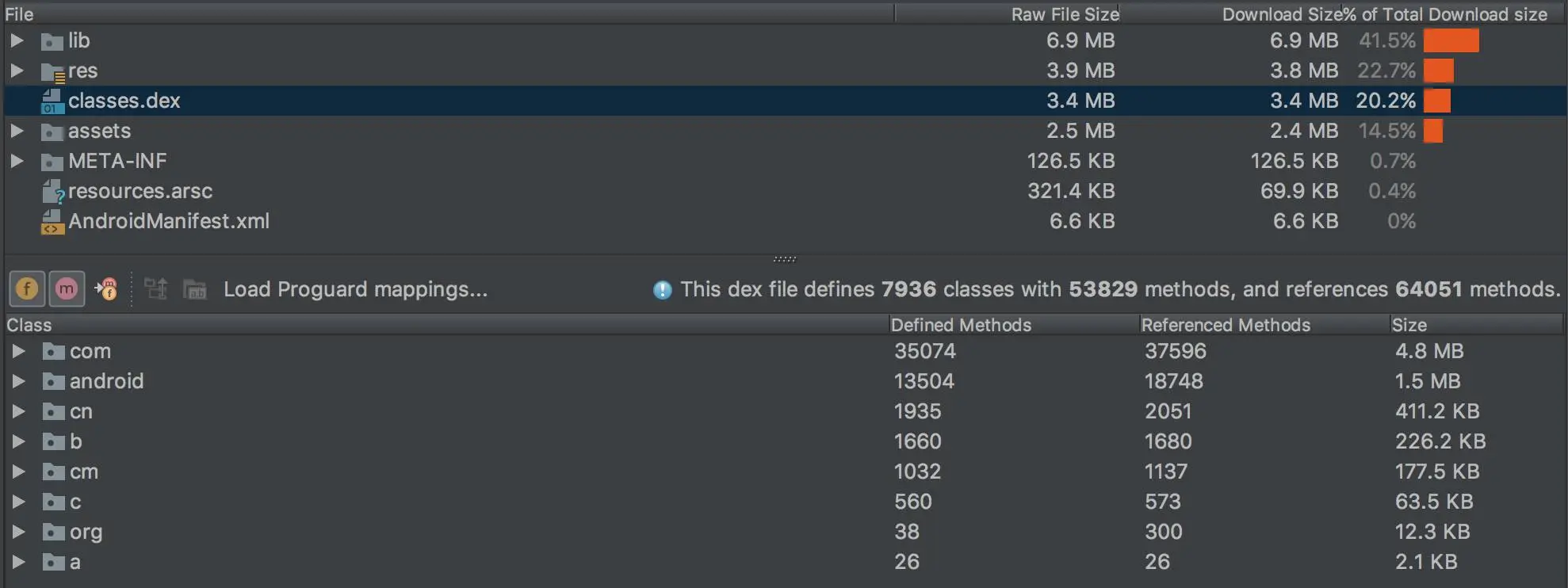 3.0 版本对 APK Analyzer 的功能做了进一步强化。主要在于:对于使用 ProGuard 混淆过的 APK 文件,我们能够上传 mapping.txt 文件进行代码还原;Dex 文件提供显示各个包目录的大小;等等。