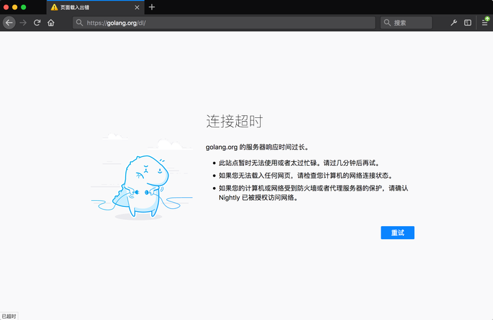 我们在开始之前先要准备Go语言的环境,如果你已经安装过了这步可以略过。你可以在 这里 下载到最新版的Go语言版本,如果你的网络环境被迫是下面这个样子。