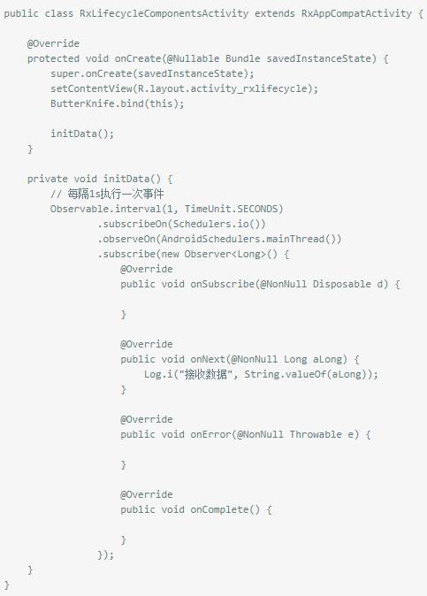 很简单,每隔1s发送一条数据,因为关闭Activity之后没有取消订阅,RxJava还继续持有Activity的引用,所以在内存回收的时候,该Activity不会被回收,由此引发内存泄漏。