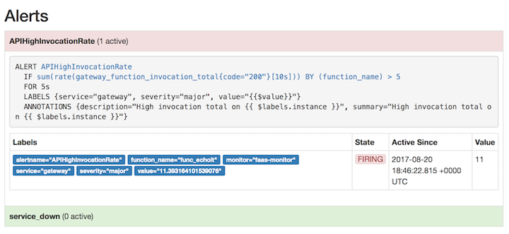 pj814yluzyyo func_alertmanager replicated 1/1 alexellis2/alertmanager-armhf:0.5.1 *:9093->9093/tcp