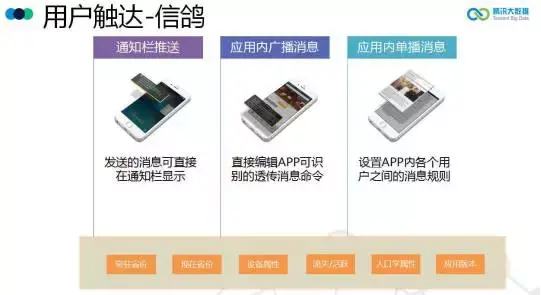 同时腾讯移动分析(MTA)也在打通产品生命周期中用户使用场景的各个环节,来不断提高产品价值,例如与推送工具,如腾讯移动推送(信鸽),进行打通,让用户可以使用MTA的用户画像数据针对不同的用户进行精准消息推送,避免打扰用户,提高用户活跃度。