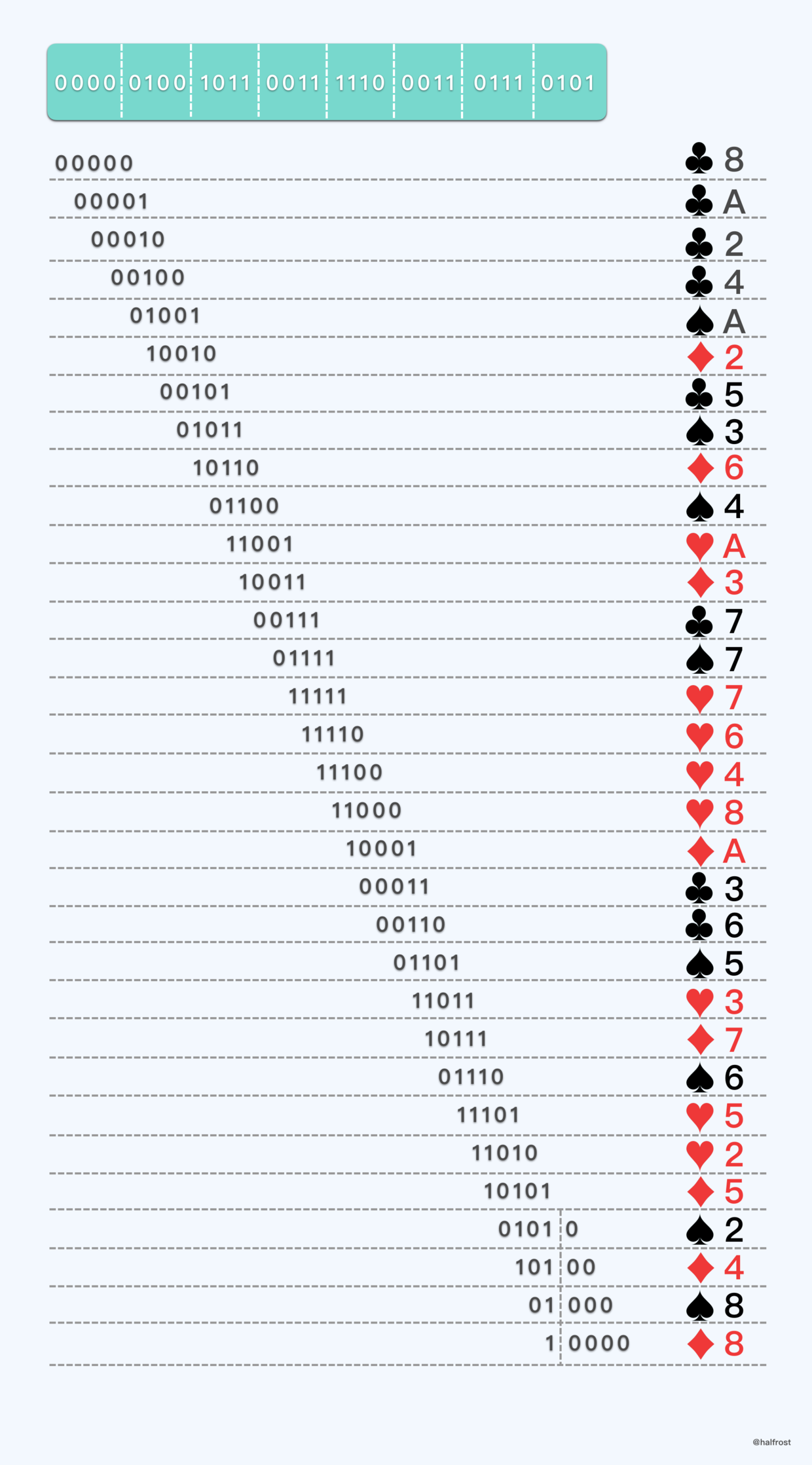 将窗口大小为5的德布鲁因序列每5个二进制位都转换成扑克牌的编码,如下: