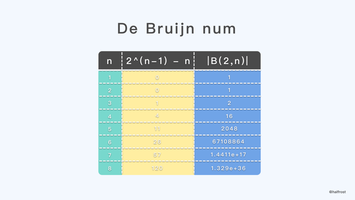 最最常用的德布鲁因序列就是 k = 2 。计算一下 |B(2,n)| 的数量,如下: