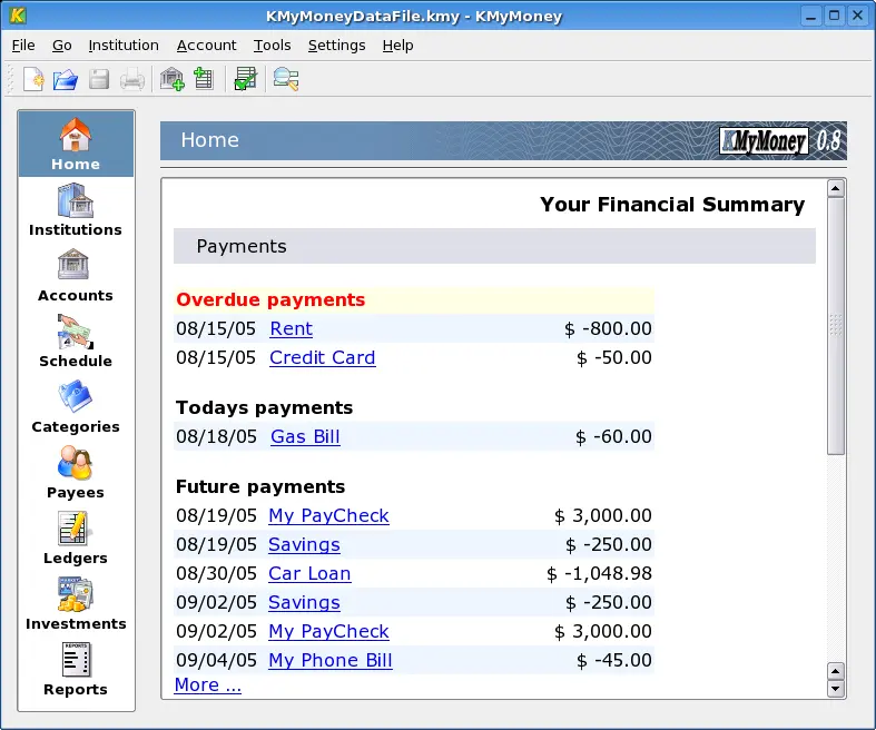 KMyMoney 是 KDE 家族系列应用的成员,旨在实现三大目标:准确性,这对金融工具至关重要;易于使用,确保用户开始并继续使用它;和熟悉的功能,便于从其他同类产品迁移。