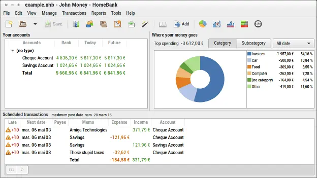 HomeBank 支持从 Intuit Quicken、Microsoft Money 或其他软件轻松导入,支持银行卡、现金、资产、信用卡多种账户类型,支持计划交易、类别拆分、内部转让、月/年预算等实用功能。