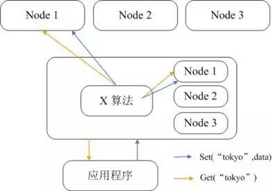 Memcached 本身并不支持分布式,因此只能在客户端通过像一致性哈希这样的分布式算法来实现 Memcached 的分布式存储。下图给出了 Memcached 的分布式存储实现架构。当客户端向 Memcached 集群发送数据之前,首先会通过内置的分布式算法计算出该条数据的目标节点,然后数据会直接发送到该节点上存储。但客户端查询数据时,同样要计算出查询数据所在的节点,然后直接向该节点发送查询请求以获取数据。