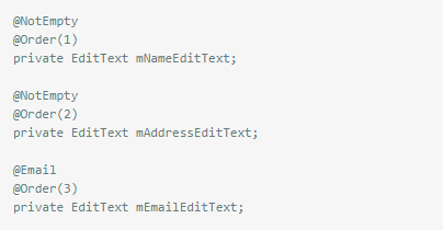 我们一般来说界面上会有好几个EditText,比如name,email,address三个输入框,我们会对三个输入框都设置相关的规则,这时候每个app中对于这些输入框的判断的顺序有所要求,比如先是判断name,然后依次往下判断,但有些可能先判断 address等。所以@Order就是用来让我们验证好几个EditText时来进行排序的。