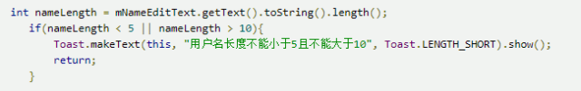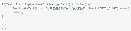当每个都填了内容后,你可能还要相应的不同的EditText还有相应的规则,比如我们上面已经判断了用户名不为空了。然后我们的APP有规定,用户名的长度不能小于5同时不能大于10,然后你又要写: