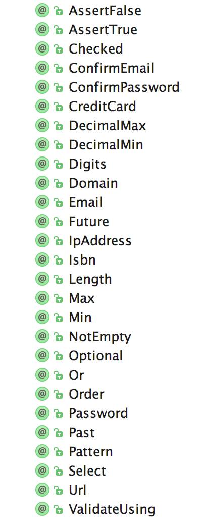 @NotEmpty :非空@Length: 长度 @Email: 邮箱@Password:密码(默认是6位)@ConfirmPassword:确认密码 @Checked:CheckBox是否被选中@Length:长度判断 IpAddress:ip地址判断