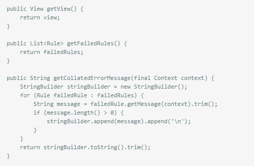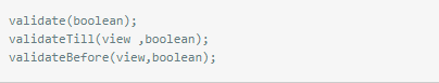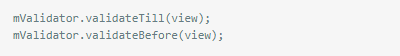 validateTill:比如有a,b,c,d四个View,并且order的顺序相对应也是1,2,3,4,比如当前四个View都不符合规则,并且你调用了validateTill(c),那么我们的List<ValidationError> errors中就包含了a,b,c。如果你调用了 validateBefore(c),则List<ValidationError> errors就包含了a,b,也就是比传入的View的Order小的会被包含。