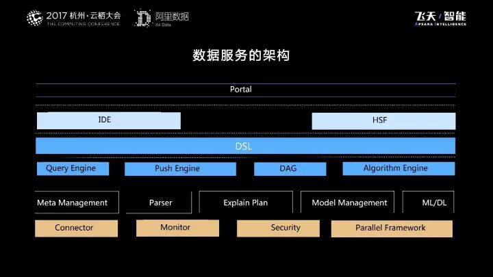 中间这层是DSL,通过DSL我们把用户获取数据的标准和规范进行了统一,整个DSL之下有一些大的核心能力。QueryEngine实现所有跟查询相关的能力输出;PushEngine提供实时数据推送的能力;DAG可视化,可配置编排业务逻辑。Algorithm Engine输出算法和人工智能的能力。