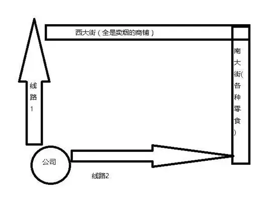 程序员一听,程序里面写死了,从线路1去西大街,买完烟再沿线路2返回。