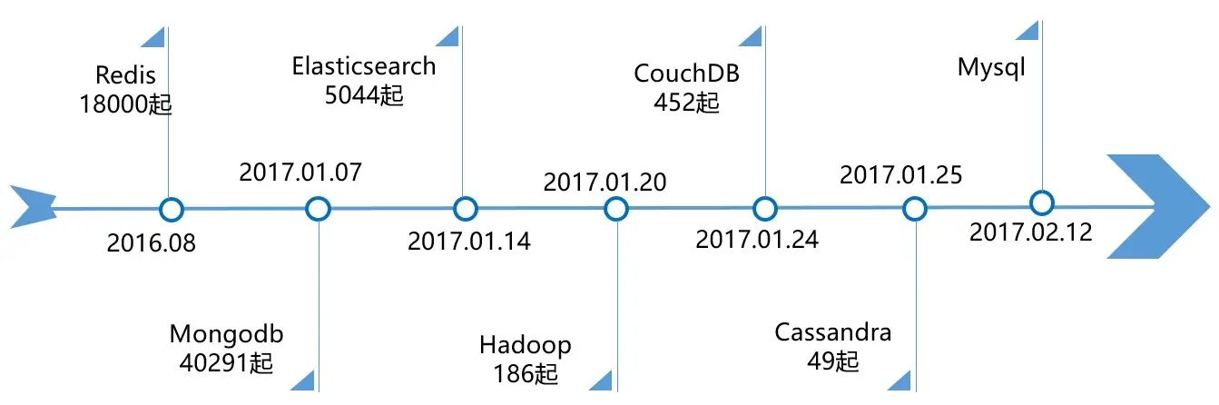 主机、DB、SSH等使用弱密码、空密码认证,使黑客可以轻而易举的进入。2017年爆发的众多数据库勒索事件均是由于用户将数据库开放在公网且未设置有效的身份认证而导致的。