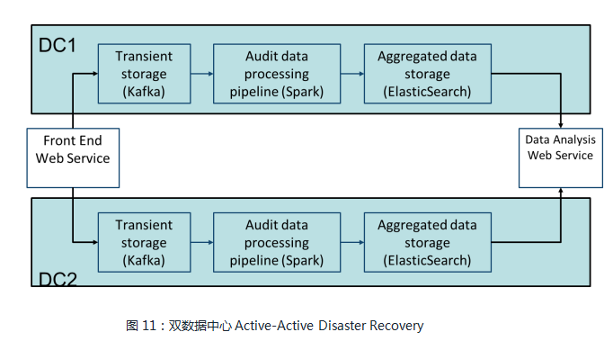 通过双数据中心Active-Active灾备(Disaster recovery)如图11所示,来进一步保证高可用高可靠的服务。整体架构保证数据流同时通过两个同构的审计处理管道进行处理,即使一个数据中心因为各种原因下线,整体服务还是处于可用状态,进而保证全天候的数据质量审计与监控。