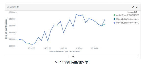 工程师可以通过图7中所示简单图表来了解数据完整性的状态,图7所示包含两个数据处理阶段:一个数据生产者和两个数据消费者的应用案例。所以图表中实际上是三条线,绿色是生产者的实时数据量,蓝色和紫色线是两个数据消费者处理的数据量。如果在理想情况下,数据完整性没有问题,这三条线是完全重合。本例中在最后一个点出现了分叉,代表数据完整性出现问题,需要工程师进行干预。