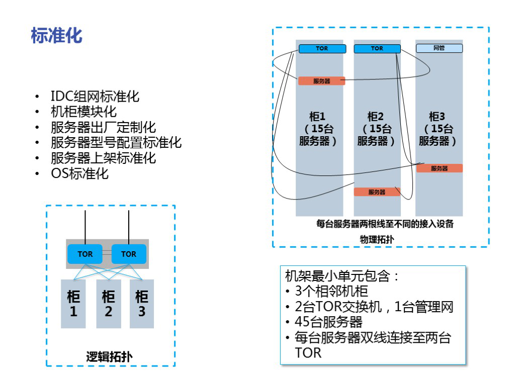 服务器出厂和上架也要做定制化。我们把资源标成一个个模块,最小的模块是3个机柜,每个机柜放多少台服务器是固定的。生产的时候,比如说我要采购一千台服务器,我告诉厂商我已经规划好了,这一千台服务器放在哪一个机房里,哪一个机柜,哪一个U位,厂商会做定制化,机器到货上架之后,厂家人或服务商把电一接,操作系统自动化安装,甚至是网络,每一层都是标准化的。