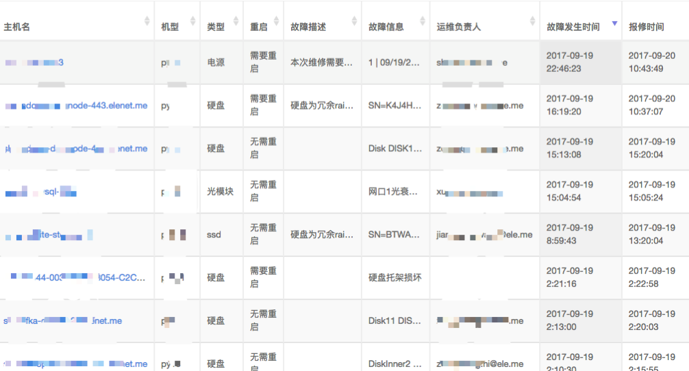 这是9月19日的图,可以看到有非常多的故障,发现这些故障之后要通知,通知也是很复杂的,是短信、电话还是内部的工具?我们要多渠道地进行通知。有的用户比较牛,他说你不用给我发邮件,我这边有一个接口,可以做自动化的发送,比如我们的服务器故障了,自动给他发一个消息,收到这个消息之后,业务就开始把这个机器关掉,甚至把数据操作等一系列操作做完,做完之后返还给报修系统一个消息:这个服务器你可以去维修了,收到这个消息之后,通知IDC、供应商:哪一个机房、哪一个机柜、哪一个U位、序列号多少的服务器发生了什么问题,请于什么时间段上门维修,同时通过各种方式告诉IDC:谁身份证号多少,什么时间会带着什么设备上门做哪一个地方的维修。