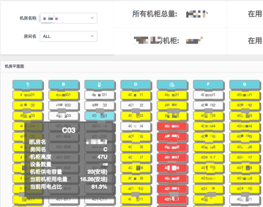 运维重点需要考虑三件事情:质量、效率和成本。上图中可以看到这是一个模块,这个模块当中有很多的机柜,这些机柜用电量很大,这就体现出了成本,我们大量的机柜是黄色,黄色是告警。一个机柜的电量是4000W、5000W,我们会尽量把资源充分利用起来,成本相对最优,所以我们的机柜都是一些比较高电的,比如说47U的机柜我们会放很多的设备。