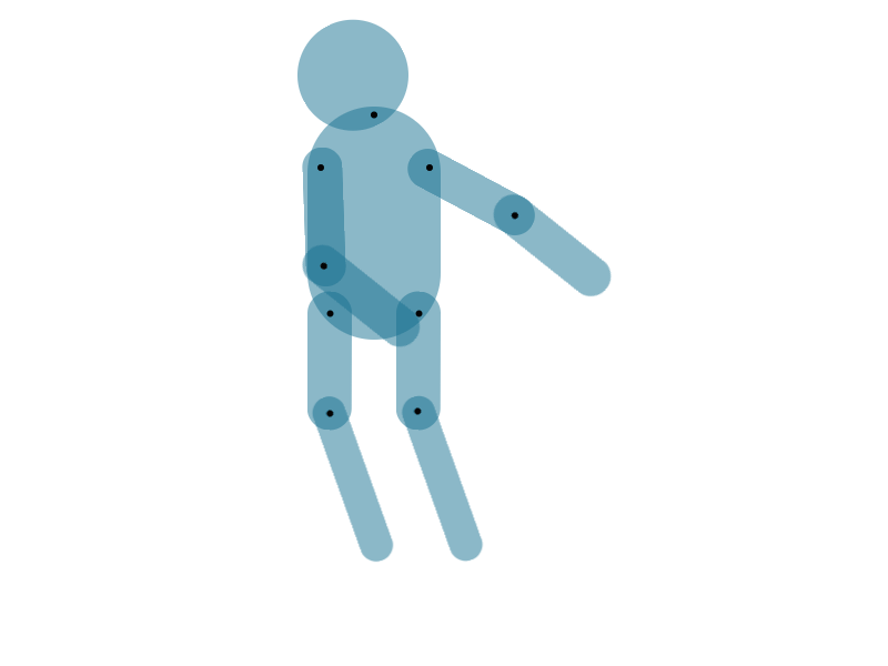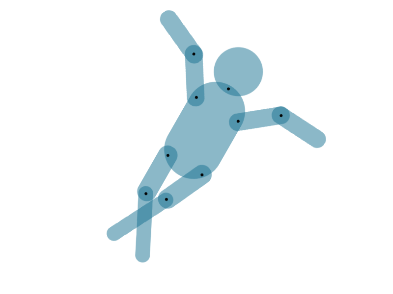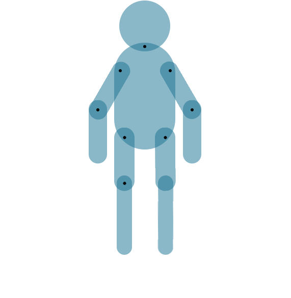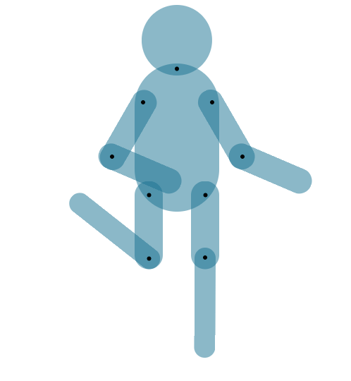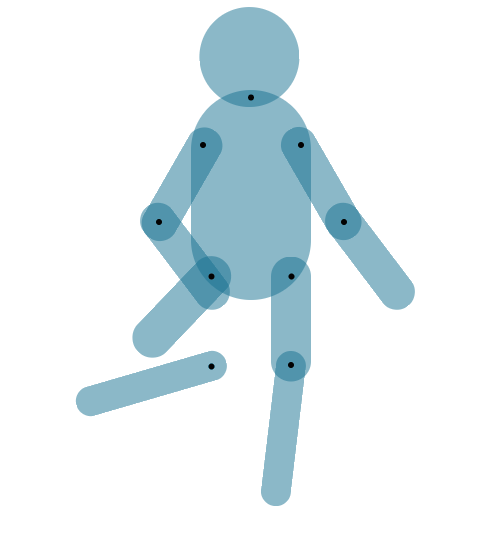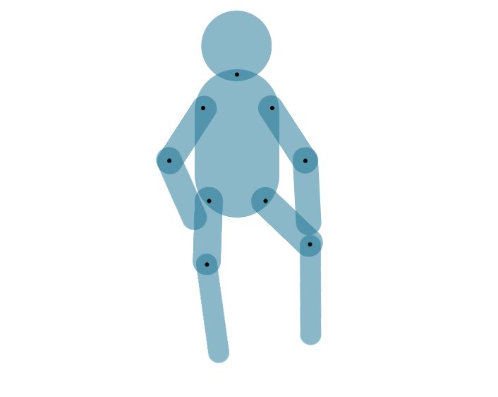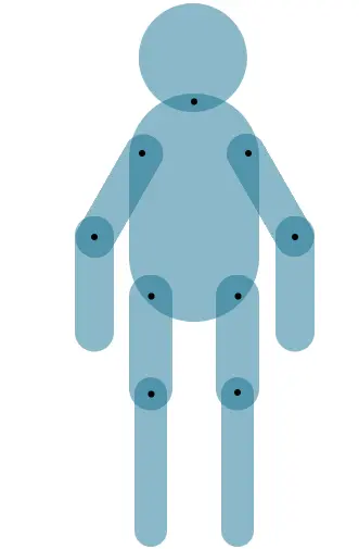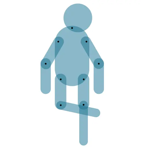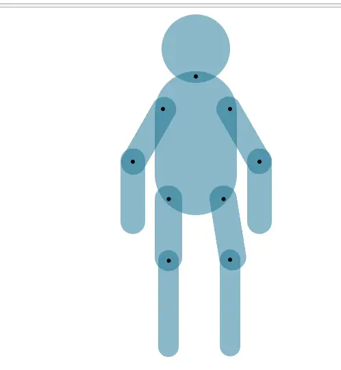 CSS部分略通一二的小伙伴都知道,再简单不过,transform:rotate属性,这里唯一要注意的是在定义animation时,一定要定义transform-origin,旋转的原点,这里就是我在关节处打了一堆黑点的意义了。因为我AI导出的SVG中,每个关节,也就是<circle>的圆心cx与cy的值,就是各个部位旋转的原点。