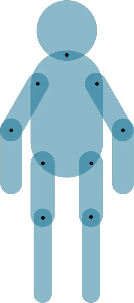 先来个简易版的机械人吧,因为重点是动效,所以就简易到不能再简易,全部胶囊样式的圆角矩形来搞,但为了方便以后替换个胳膊腿什么的,我还是乖乖的把每个准备运动起来的零件都拆分到了不同的图层,并且给关节部位打了一个螺丝钉。好吧好吧,简易螺丝钉,打了个黑点行了吧,在AI里绘制完成后,这货是下面这样滴。(为了方便叠加,我给加了透明度,后来发现有透明度居然自带设计感,那就这样吧)