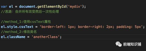 示例中,元素的三个样式被改变,而且每一个都会影响元素的几何结构。在最糟糕的情况下,这段代码会触发三次重排(大部分现代浏览器为此做了优化,只会触发一次重排)。从另一个角度看,这段代码四次访问DOM,可以被优化。