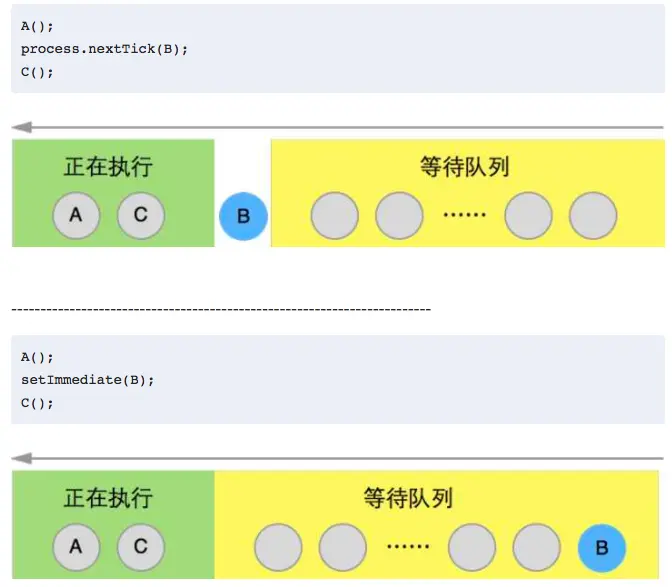 setTimeout(fn,0)差不多,都是相当于立即在事件队列末尾插入一个事件,但也有差别。process.nextTick(fn,...args)表示在当前调用栈结束后,在下一个事件执行前调用回调函数。node 提供这个API是为了把复杂耗时的任务放到最后去处理,以便优先执行简单的任务。来看它们之间的比较:setTimeout(() => console.log("setTimeout0"),0) setImmediate(() => console.log("setImmediate")) process.nextTick(() => console.log("nextTick")) //输出nextTick setTimeout0 setImmediate 或者 nextTick setImmediate setTimeout0无论