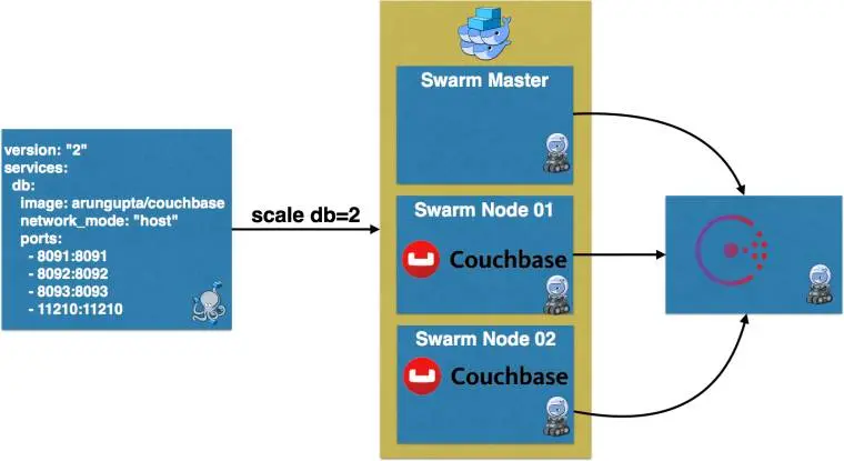 上图中的Docker Compose是官方编排(Orchestration)项目,它提供了一个YAML格式的文件,用于描述一个容器化的分布式应用,并且提供了相应的工具来实现一键部署的功能。下图给出了两节点的Couchbase集群对应的YAML文件定义,此Couchbase集群随后被部署到了Swarm集群中的两个Node节点上。