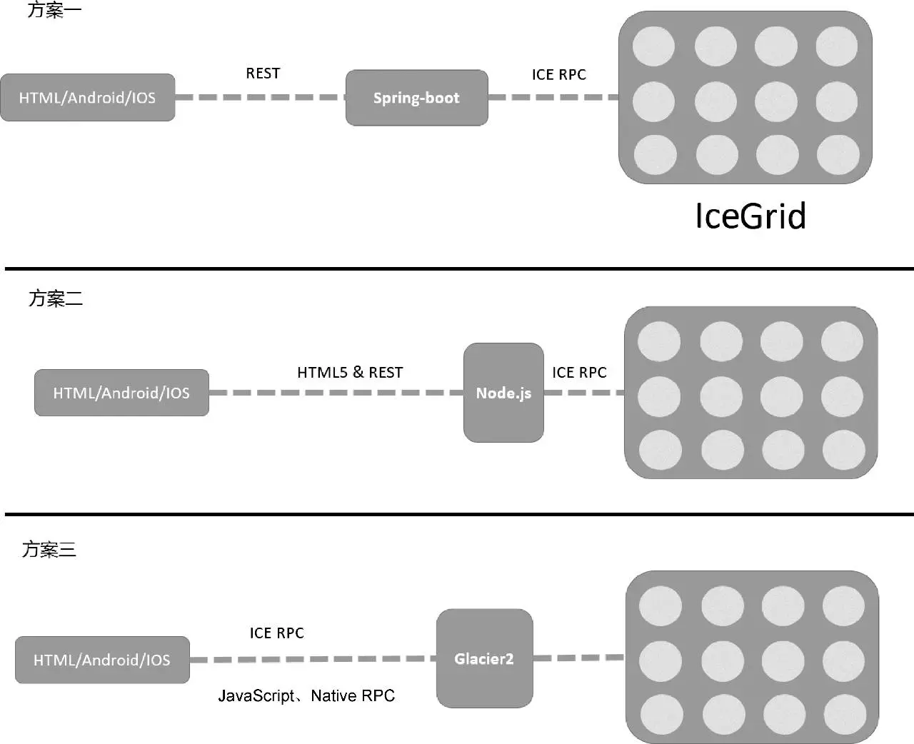 方案二与方案三则比较适合前端JavaScript能力强的团队,比如很擅长Node.js的团队可以考虑方案二,即用JavaScript来替代Spring Boot实现REST服务。主要做互联网App的系统则可以考虑方案三,浏览器端的JavaScript以HTML5的WebSocket技术与Ice Glacier2直接通信,整体高效敏捷。