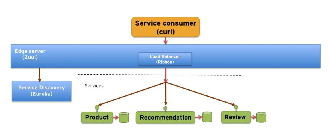 Zuul从Eureka那里获取服务信息,自动完成路由规则的映射,无须手工配置,比如上图中的URL路径/customer/*就被映射到Customer这个微服务上。当Zuul转发请求到某个指定的微服务上时,会采用类似ZeroC IceGrid的客户端负载均衡机制,被称为Ribbon组件,下图给出了Zuul与Eureka的关系及实现服务负载均衡的示意图。