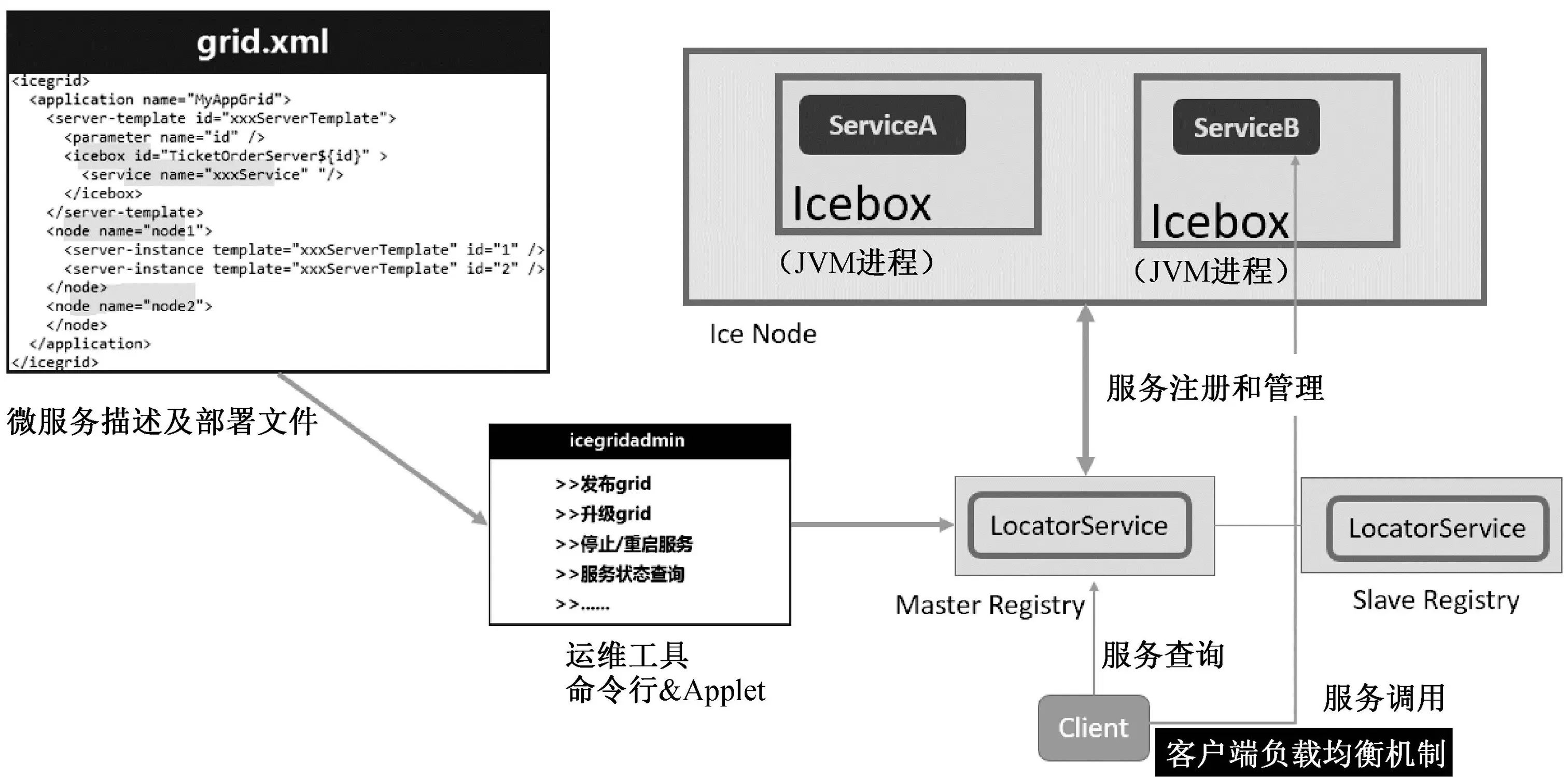 ZeroC IceGrid作为一种微服务架构,它基于RPC框架发展而来,具有良好的性能与分布式能力,如下所示是它的整体示意图。