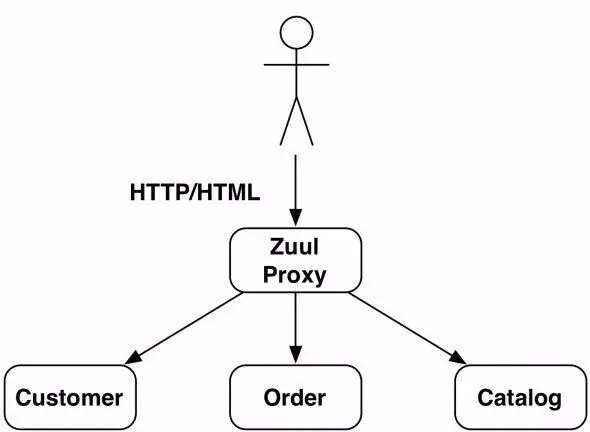 那么Spring Cloud是如何解决服务的负载均衡问题的呢?由于Spring Cloud的微服务接口主要是基于REST协议实现的,因此它采用了传统的HTTP Proxy机制。如下图所示,Zuul类似一个Nginx的服务网关,所有客户端请求都通过这个网关来访问后台的服务。