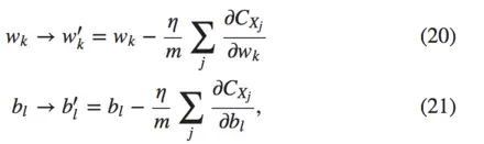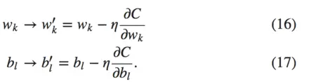 那么我们怎么在神经网络中使用梯度下降呢?在公式(6)中我们用权重和b来替换v,梯度向量 ∇C有两个组件 ∂C/∂wk 和 ∂C/∂bl,分开写就是: