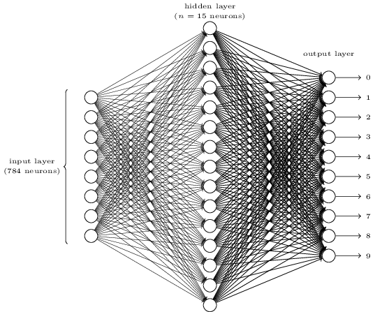 上图中输入是784=28×28的图片的像素灰度值,但是图中为了表示方便省略了很多输入神经元。输入中的像素灰度值0代表白色,1.0代表黑色,0和1之间的值代表逐渐变黑的灰色。