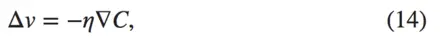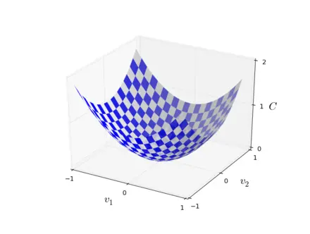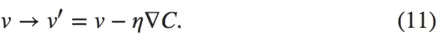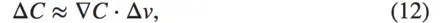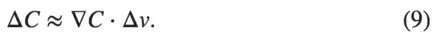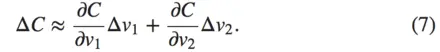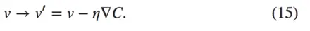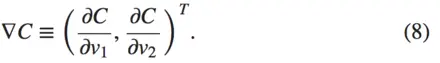 我们的目的就是选择Δv1和Δv2让ΔC最小。我们把v 的变化定义为向量, Δv≡(Δv1,Δv2)^T,那么C的梯度的偏导数是∇C: