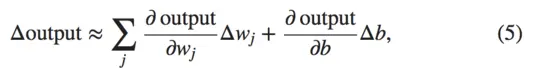 上面的公式代表的是:所有的权重改变量和输出相对于权重偏导数的乘积之和加上输出相对于b的偏导数与 Δb的乘积。如果你对偏导数感觉到难以理解也不要慌张,你可以理解成Δoutput相对与Δwj 和 Δb的改变时线性的函数,也就是当稍微改变权重和b的时候,其输出也会跟着有一点小的改变。