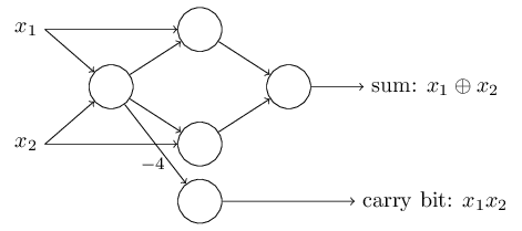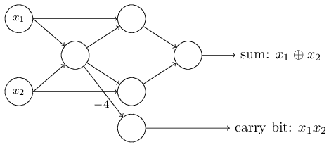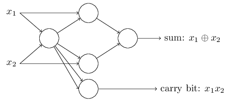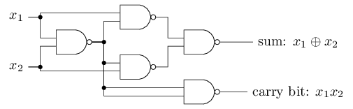 而我们可以使用与非门建立任何的逻辑门阵列。例如,我们可以使用与非门来建立一个电路,它增加了两个比特x1和x2。 这需要计算按位和,x1⊕x2,当x1和x2均为1时进位位被设置为1,即进位位只是乘积x1x2: