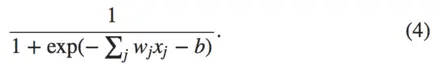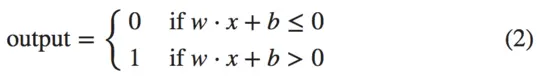 让我们简化描述感知器的方式。我们用w⋅x代替所有w和x的乘积之和,这里的w和x是所有权重和输入的向量。用b代替阀值threshold,使得b=-threshold。所以perceptron公式可以写成: