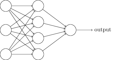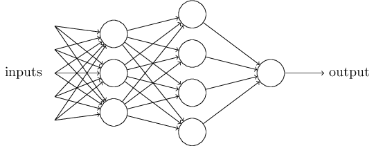 最左边一列叫做输入层(input layer),该层的神经元称为输入神经元层。最右边或输出层称为输出神经元(output neurons),例子中只有一个输出神经元。中间这一层叫做隐藏层(hidden layer),例子中只有一个隐藏层,但是很多网络都有多个隐藏层。例如下面图中的4层网络中有2个隐藏层: