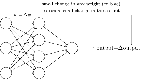 学习算法听起来是非常糟糕的。但是我们要如何为神经网络设计算法呢?假设我们有一个感知器网络,并想用它来解决一些问题。例如,输入手写数字图片的像素数据,我们希望通过神经网络学习调整权重和b的值来正确的识别这些数字。我们来看一下神经网络是怎么学习的,当我们调整权重的值时,相应的会改变一些输出的值。所以,目标就变得可以学习了,学习的过程就是不断调整权重和b的值,来改变输出的值,使其输出更加接近真实的值: