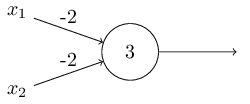 我们已经知道,感知器是一种可以衡量输入因素权重并作出决定的方法。现在我们可以用感知器来表示计算机的基本逻辑函数,例如与非、或、与等函数。下面我们假设有两个输入,每个输入的权重都是-2,阀值为3的感知器: